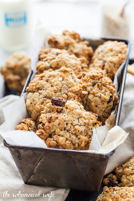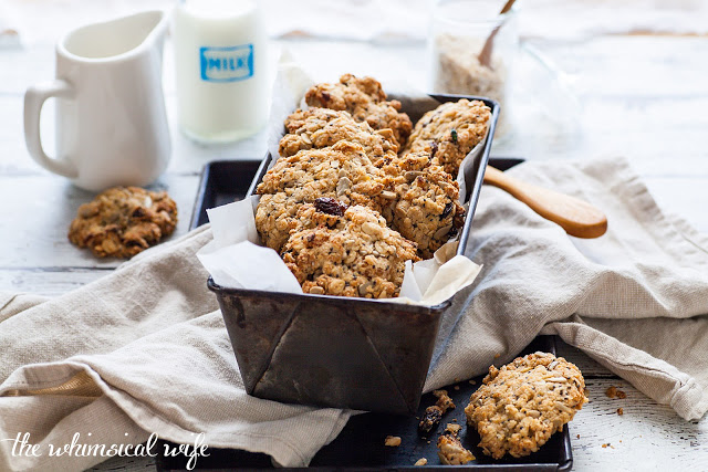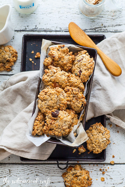 I know we are nearly at the end of the school term but let me just stop here and say I hate making lunches and I only have to do it two days a week. I am not sure how I am going to go when I have to make three lots of lunches, five days a week. I am not one of those mums that cut cute shapes out of my kid's sandwiches or create this fantastical looking lunch box. It's a honey sandwich for my kids, some fruit, something home baked items like these cookies and some seeds. I shudder a little to think how many years I've got ahead of me to pack lunchboxes.