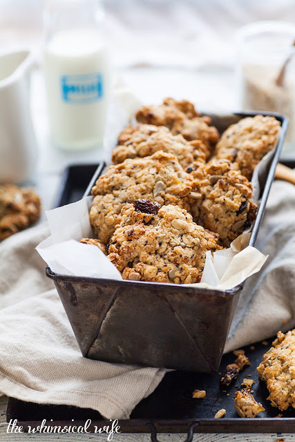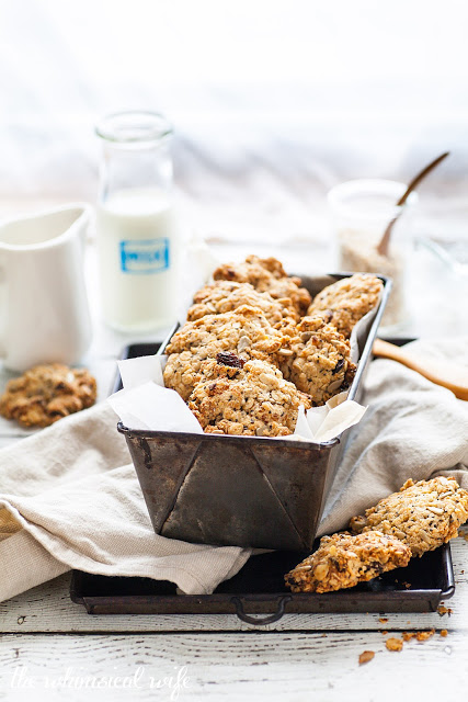 So I have been lying in bed looking at the ceiling with my mind ticking over since 4.36am this morning. Hubby has already got up and gone on a bike ride this morning while I twiddle my fingers looking at the ceiling. I can't even blame the kids for keeping me awake. I gave up trying to go back to sleep at 5.55am and decided to get up and tell you guys about these pretty damn good Get In My Belly Granola Cookies. Isn't that what everyone else thinks about at unearthly hours of the morning. The sun isn't up yet, and here I am sipping bone broth like a hipster talking to you about cookies. Seems a bit surreal in the misty hours of today but trust me when I tell you these cookies need to be made. Maybe don't start baking before the sun is up the other members of the household might not be happy. However get a batch in the oven before hubby walks through the door at the end of a long week or the kids bouncing through the door after a big week at school. These totally need to be added to lunchboxes too because I went the nut free route since my little guy is now in Kindy and we need this kind of snack to fill out the lunchbox.