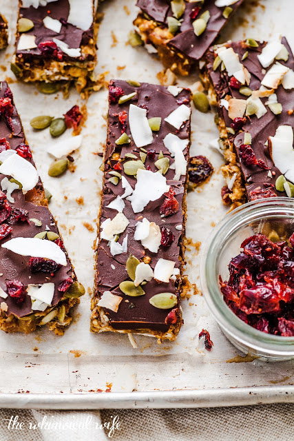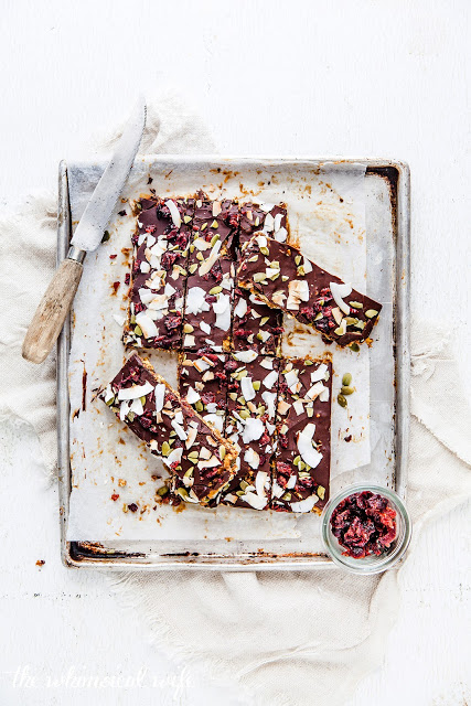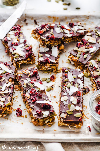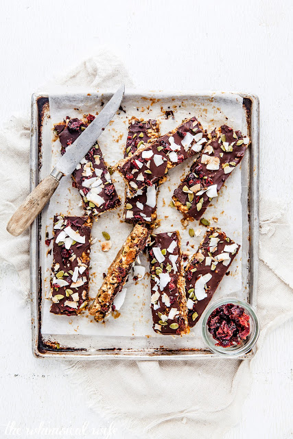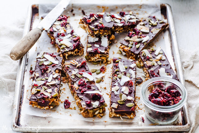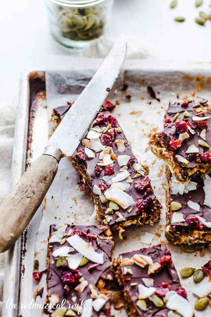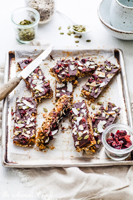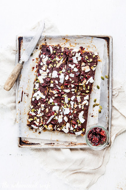 Oh.My.Goodness. Have I got a delicious recipe for you today? These Salted Caramel Fruit & Seed Popcorn Bars are the dog diggity bomb. Think a caramel covered popcorn slice filled with cranberries, apricots, sunflower and pumpkin seeds covered in glorious dark chocolate all sprinkled in some extra goodies. I have been so inspired in the kitchen lately and I am so happy that I have got my mojo back. I find throughout my pregnancy and in the early postpartum days my interest in cooking wanes significantly and to try and conjure a basic meal is hard enough let alone trying to be creative. I'm glad that has all changed. Mind you it seems most recipes are chocolate or cake related but I can live with that if you can. The waistband on my pants might have something to say about it though.