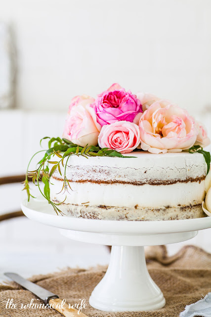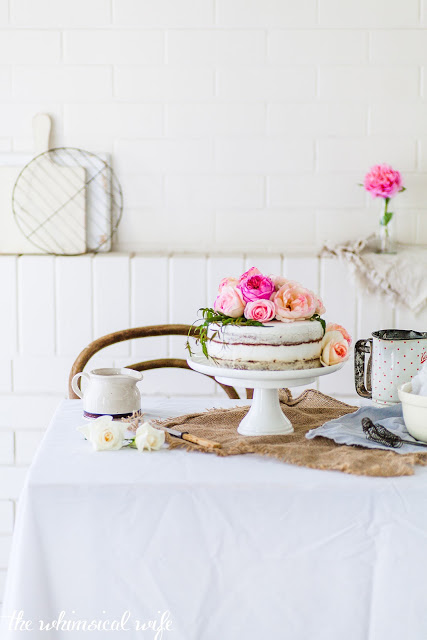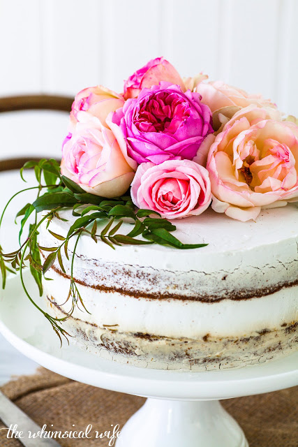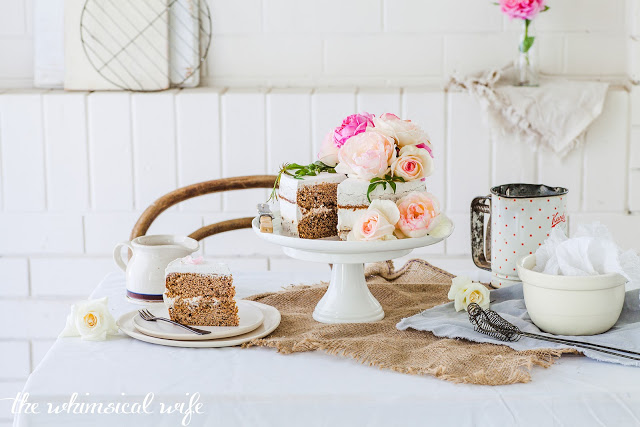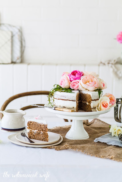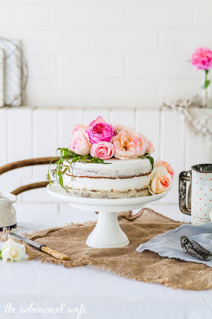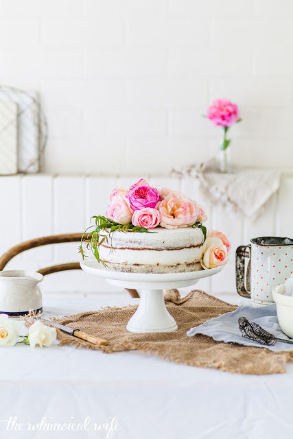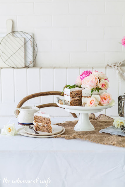 Sandwiched in between the cake is a delightful punch of marmalade and then topped with lashings of lightly sweetened whipped coconut cream in between the layers and smeared on the outside. No rich buttercream icing here. I went with the on trend naked cake icing technique to jazz the cake up and give it a bit of a whimsical style. Fits the name of the blog nicely don't you think. I raided my garden for the finishing touch. Beautiful roses and a touch of jasmine foliage. Don't be afraid to use what foliage you have in the garden but be careful you don't use anything that has been recently sprayed or that is poisonous. I had such fun decorating this cake with the roses from my garden. Don't be afraid to use varying shapes and sizes of flowers and different textures of foliage.