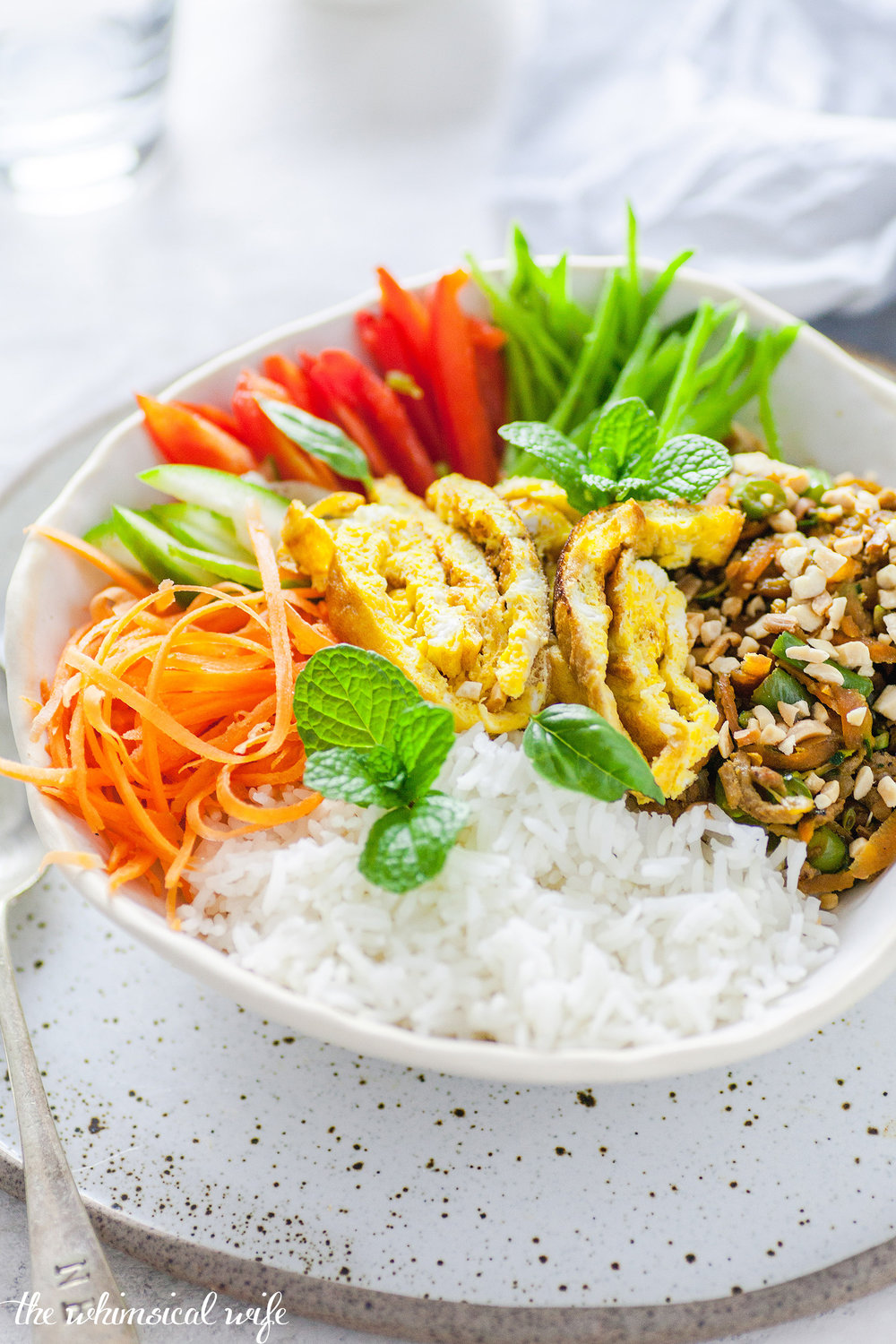 Once everything was finished cooking I scooped rice into shallow bowls followed by the Ginger Pork Mince (so good) and arranged the veggie on the side (in a tasteful manner of course) popped on some slices of egg omelette and finished with a sprinkle of peanuts. It was so good. A tip if you want to forgo the rice why not try some of some rice vermicelli or a light option try zucchini zoodles.
