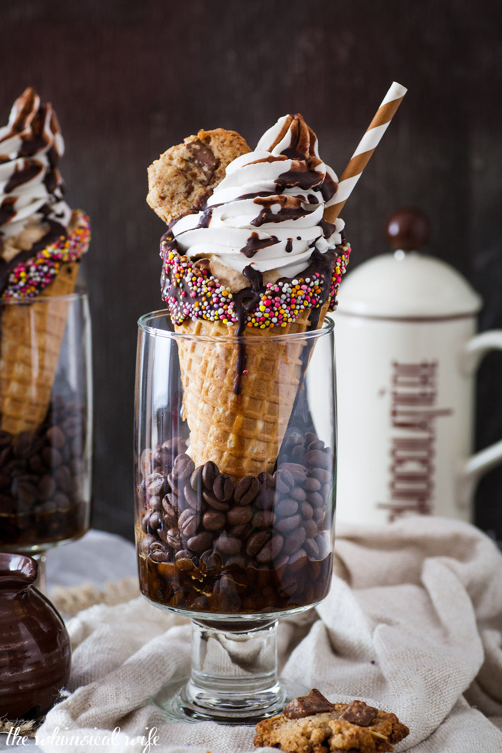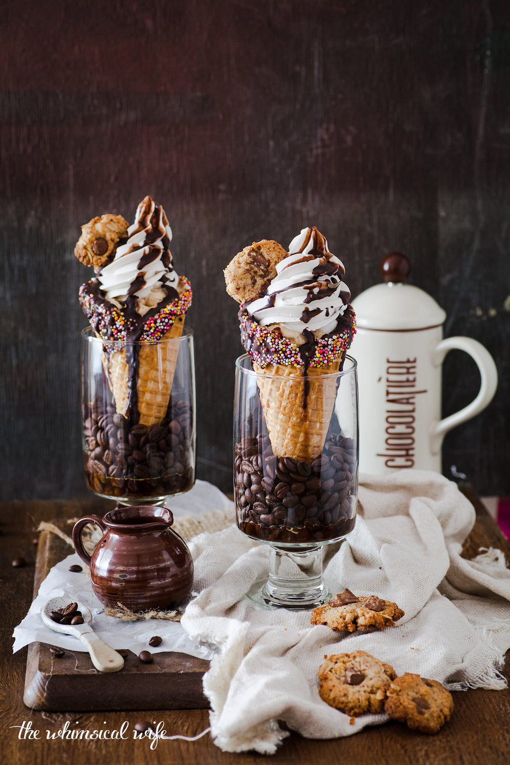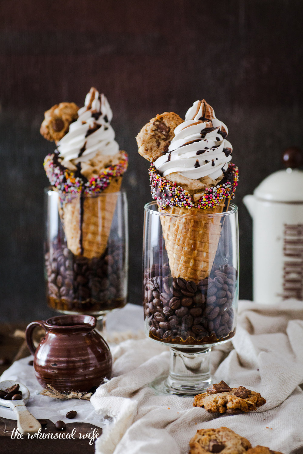 Iced Coffee Slushie Waffle Cone With Coconut Whipped Cream & Mini Choc Chunk Cookies