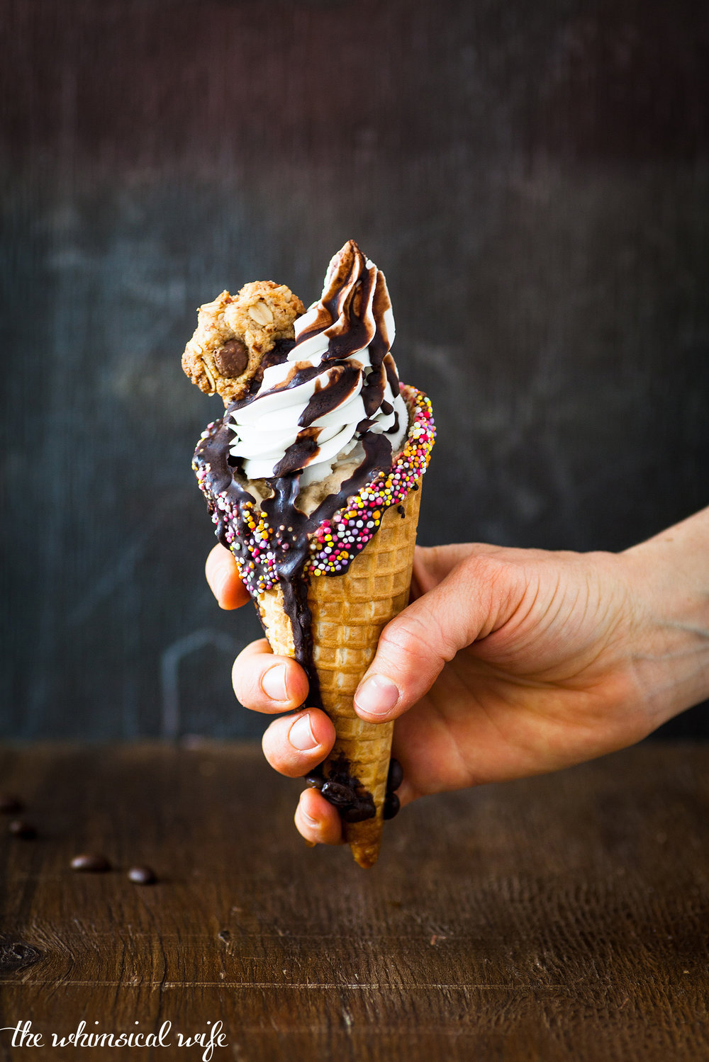 To top this crazy concoction I whipped up some coconut cream to smooth luscious waves and piped it on top of the cone drizzled with a little more chocolate. Can never have too much chocolate.
