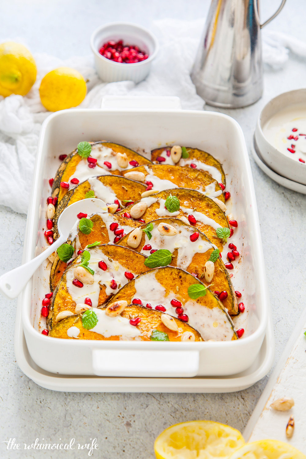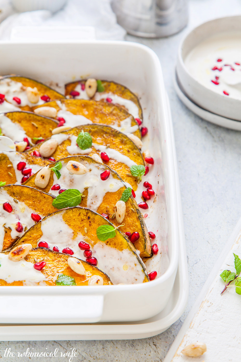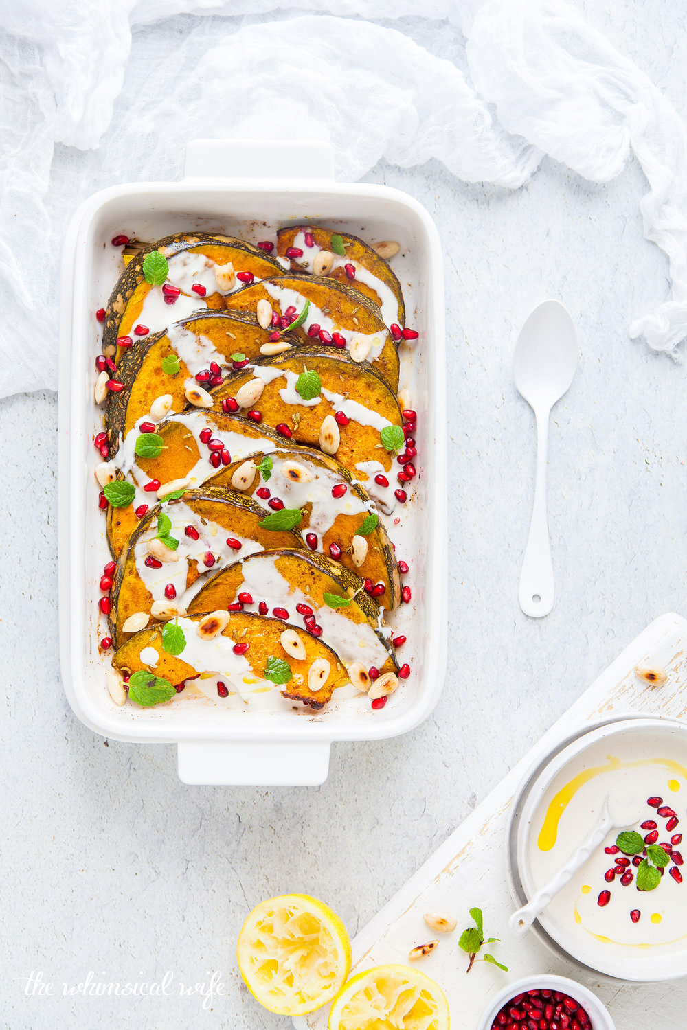 Think fragrant spices such as cumin, coriander, fennel and tangy sumac massaged into the pumpkin slices with olive oil and placed in a baking dish. These slices of sweet and spiced pumpkin are roasted until golden and tender and cooled slightly before being drizzled in the most amazing garlic & yoghurt tahini sauce - that is dairy free so makes a great allergy-friendly dish. The whole dish is then embellished with jewels of juicy red pomegranate seeds, crunchy toasted blanched almonds and finished off with fragrant sprigs of mint leaves.