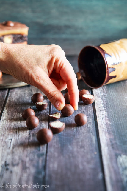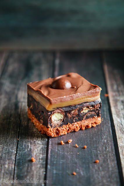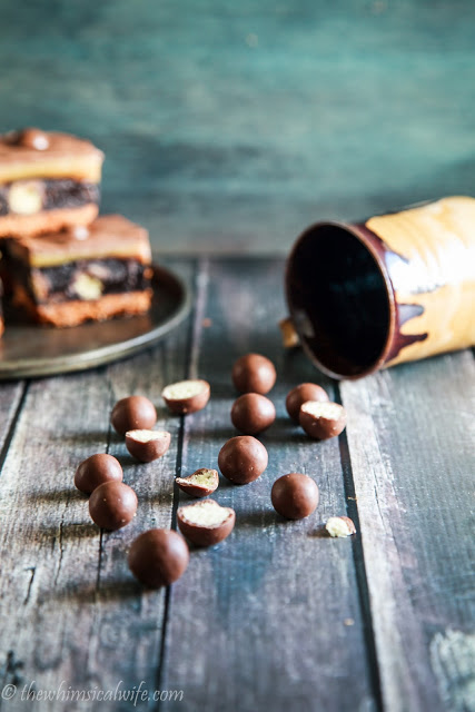 I was asked by The Reject Shop to create something special for Father's Day and what better way to celebrate the day than with this totally decadent Salted Caramel No Bake Malteser Slice. It is pure heaven in every mouthful. I hear you ask what is in it? Why I’m glad you asked, let me give you the low down on what is hiding in this delectable number. Let’s start with the bottom layer which is crushed malt biscuits blitzed with coconut and drizzled in butter and set into the perfect base to begin adding the main stars. The next layer is rich dark chocolate truffle fudge filled with crunchy pieces of Maltesers throughout. That to die for dark truffle fudge is then smothered in a layer of gooey salted caramel and if that wasn’t enough all finished with a fine layer of milk chocolate and dotted with Maltesers. Have I got your attention yet? I sure hope so!